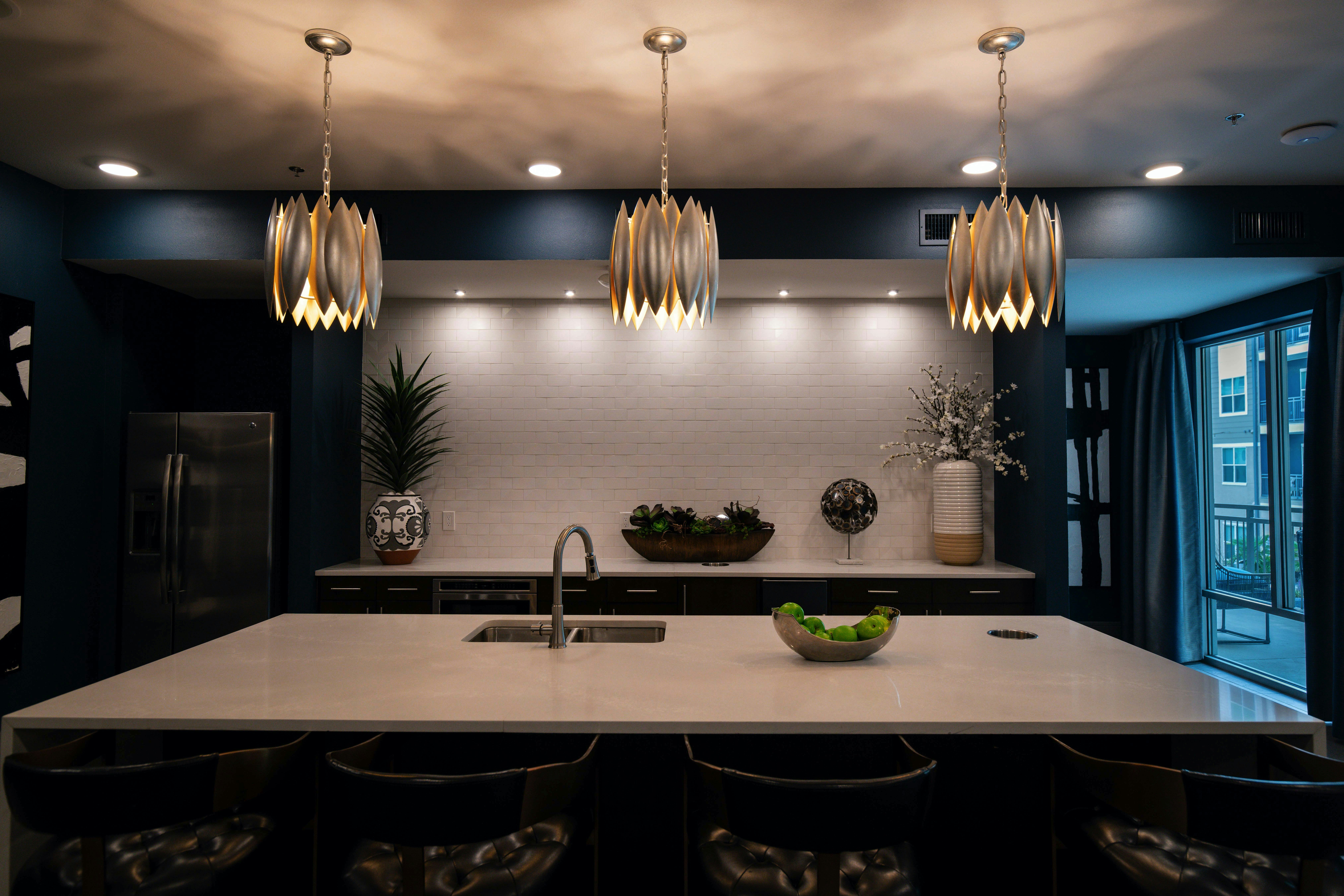 Opt for a statement chandelier above the island, infusing a touch of grandeur and creating a luxurious ambiance.